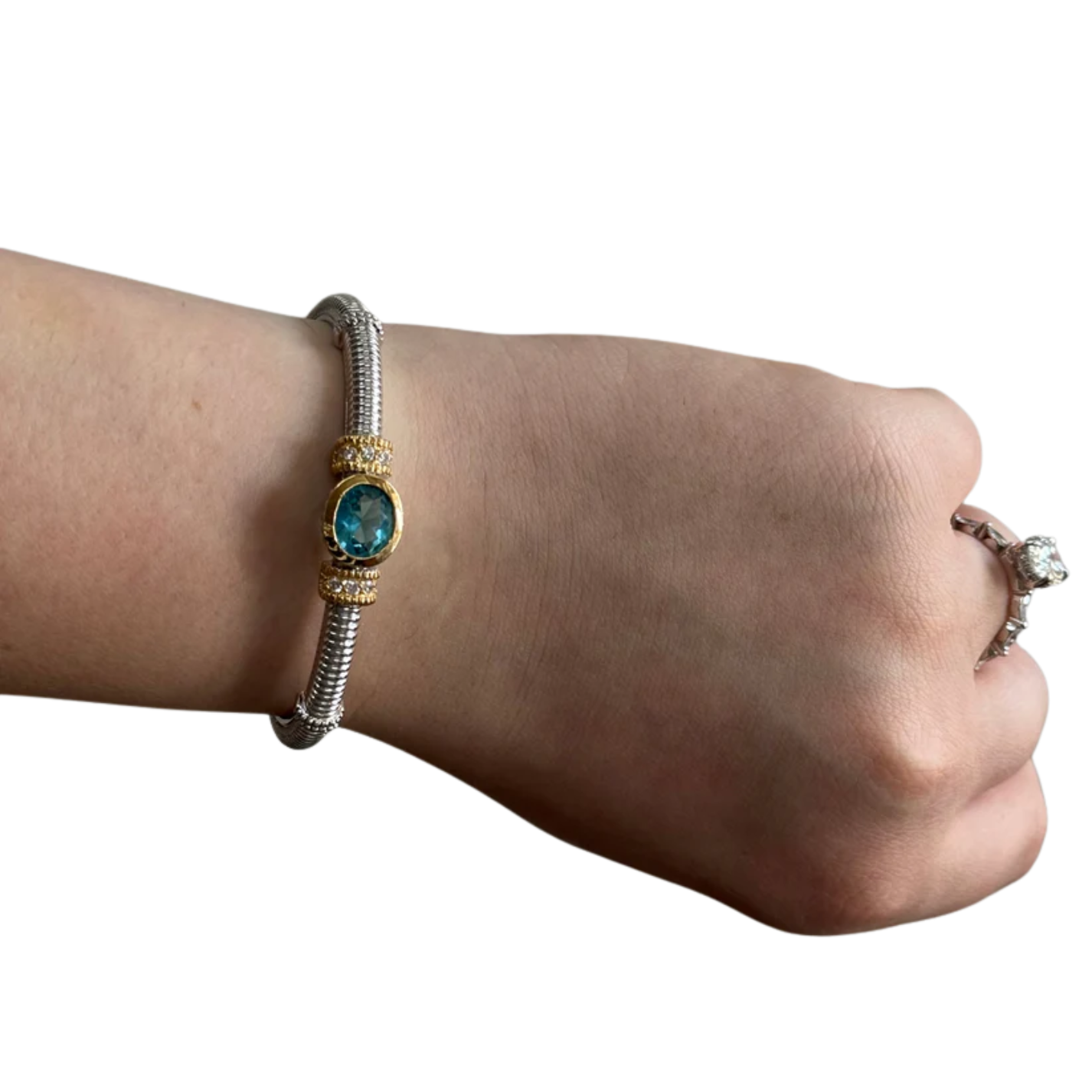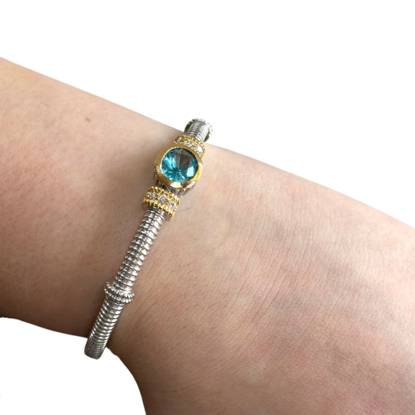 Introducing our stunning silver bracelet adorned with a captivating light blue stone, a true embodiment of elegance and charm. At the center of this exquisite piece, a mesmerizing light blue stone takes the spotlight. The stone, carefully selected for its captivating hue, radiates a soft and ethereal glow. Its light blue color evokes a sense of tranquility and serenity, adding a touch of peacefulness to your ensemble.
